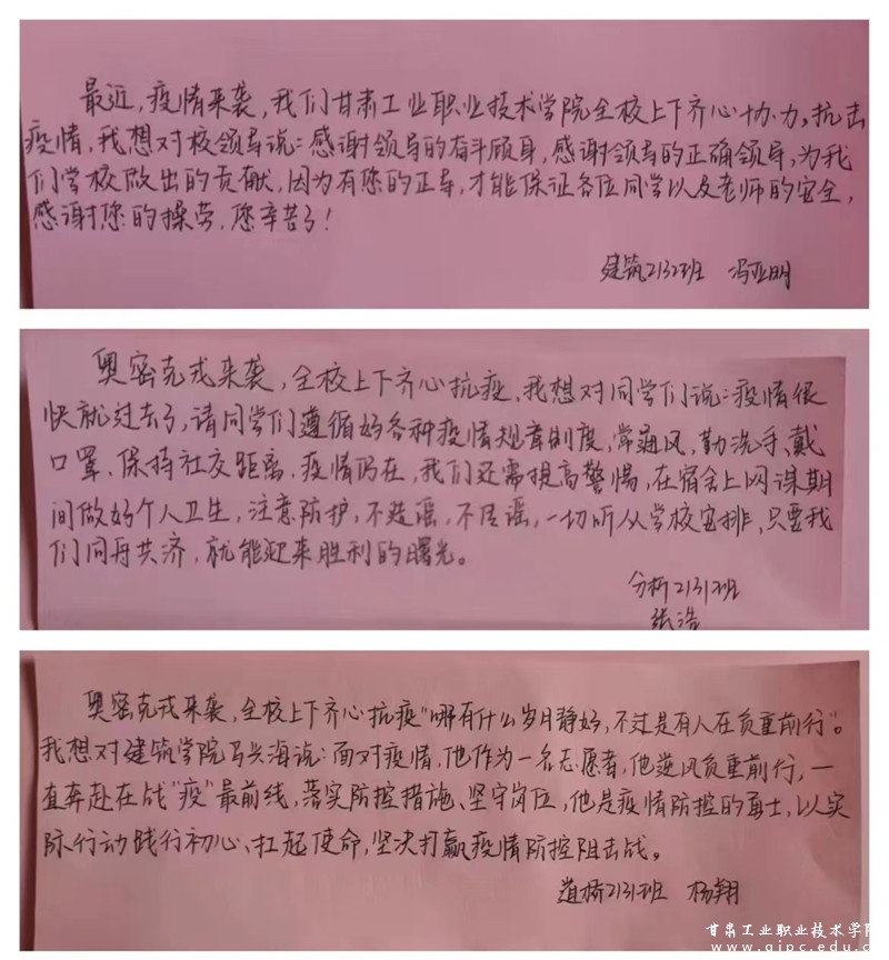 奥密克戎来袭,全校上下齐心抗疫,我想对校领导说:感谢学校对疫情的严格管控,在第一时间封闭校园,隔离外界的干扰,让我们能在如此严峻的环境下受到保护,让我们能在学校里安心学习生活。