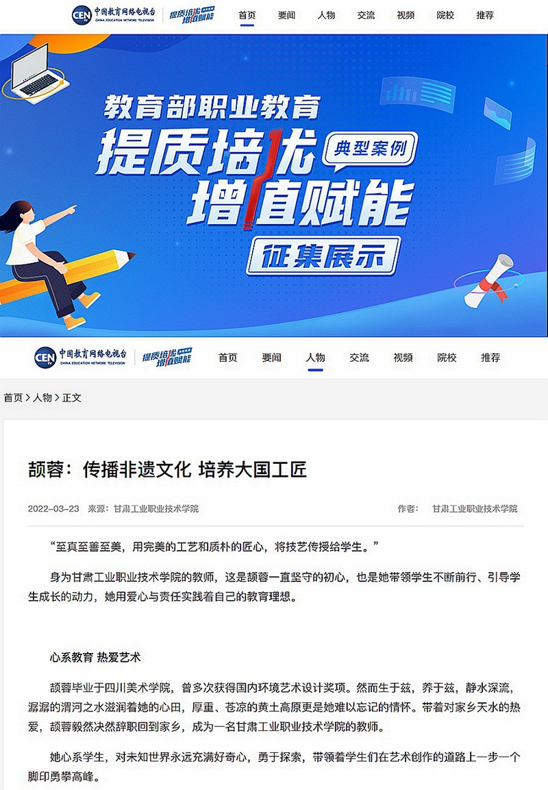 2021年6月,教育部职成司下发《关于征集职业教育提质培优增值赋能典型案例的通知》,联合中国教育电视台征集遴选“提质培优、增值赋能”优秀案例。自征集活动启动以来,1103所职业院校和地方教育行政部门积极参与,3430个典型案例在线提交,经过层层选拔,我校《传播非遗文化 培养大国工匠》成功入选优秀案例,并进入公开展示。