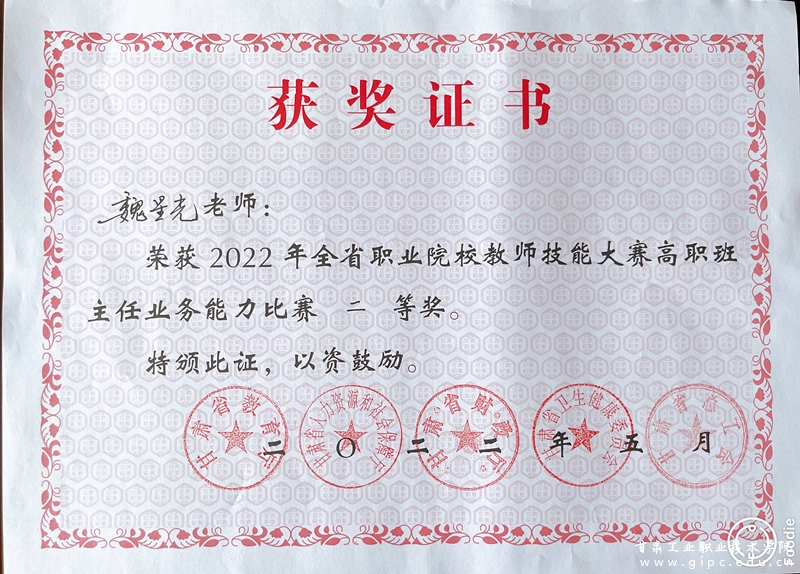 由甘肃省教育厅、甘肃省人力资源和社会保障厅、甘肃省财政厅、甘肃省卫生与健康委员会、省总工会联合举办的2022年甘肃省职业院校技能大赛班主任业务能力比赛圆满落下帷幕。我校喜获二等奖佳绩。