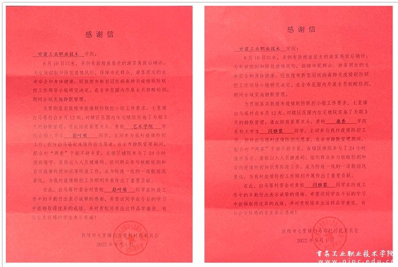 青春灼灼其华,担当历历在目。近日,我校收到了来自敦煌市七里镇白塔村村民委员会的感谢信。信中对艺术学院彭叶萌、康养学院闫雅蓉两名同学在疫情防控的严峻时刻挺身而出,积极参与本村疫情防控志愿者工作的行为给予赞赏,表扬其以实际行动展现新时代青年强烈的社会责任感,为打赢疫情防控阻击战作出贡献。同时对学院培养出这样勇于担当,甘于奉献的时代新人表示感谢。
