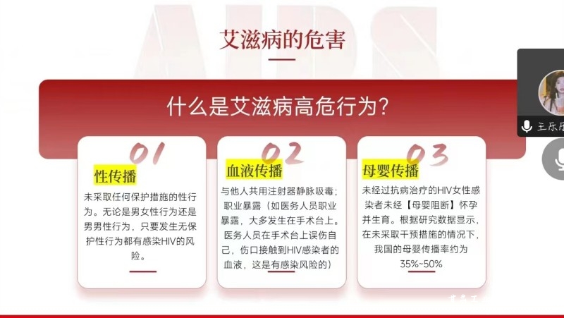 2022年12月1日是第35个“世界艾滋病日”,为帮助同学们了解艾滋病病毒的由来、传播途径、防范知识,做好艾滋病的宣传教育活动,校团委于12月10日组织各团支部线上开展“共抗艾滋·共享健康”主题团课。
