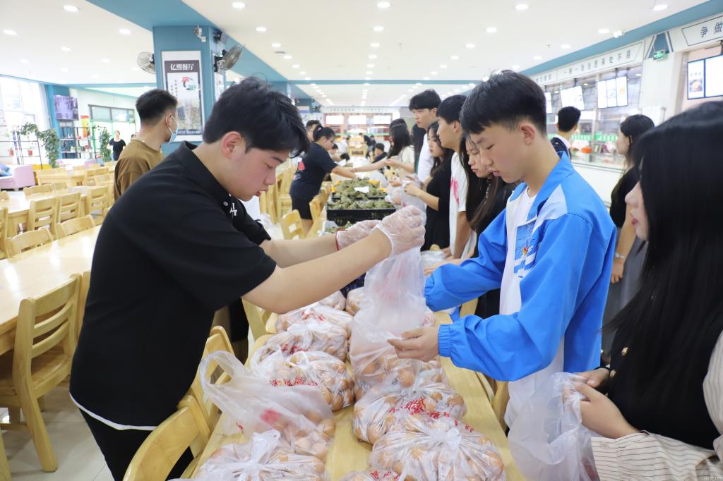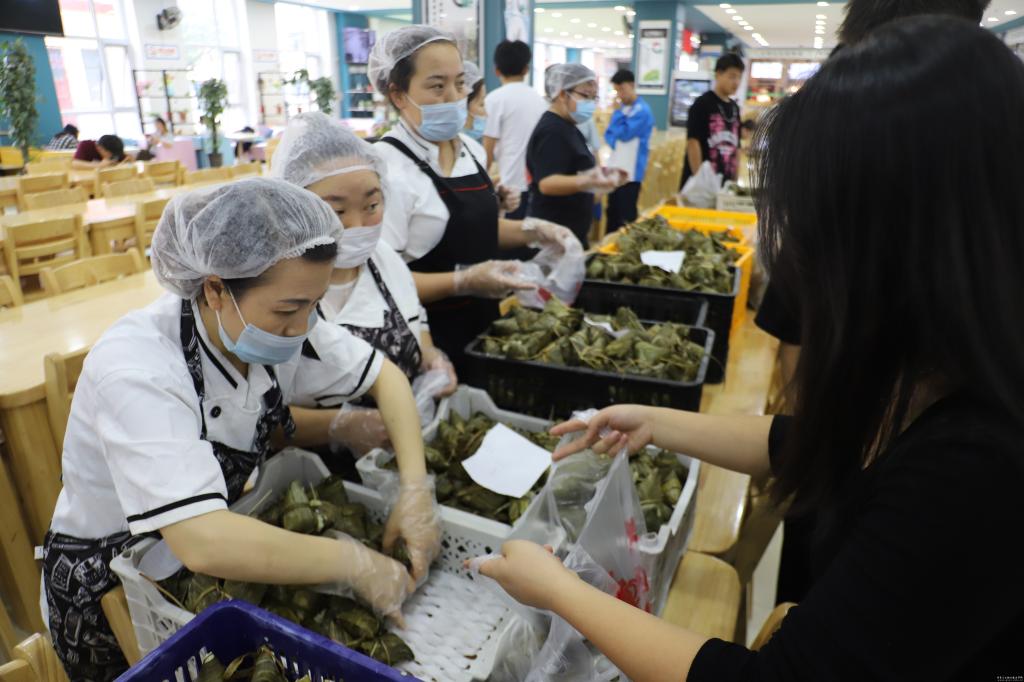 6月20日国资后勤处饮食服务中心在亿熙餐厅、新二楼餐厅、文苑餐厅、学苑餐厅、桃李餐厅、东来顺餐厅以及德育超市,设立了八个分发窗口,向全校师生分发粽子、鸡蛋以及饮品。工作人员一大早就将热气腾腾的粽子、鸡蛋及饮品摆在入口处,前来领取粽子、鸡蛋、饮品的学生都笑容满面,现场洋溢着浓厚的节日氛围。