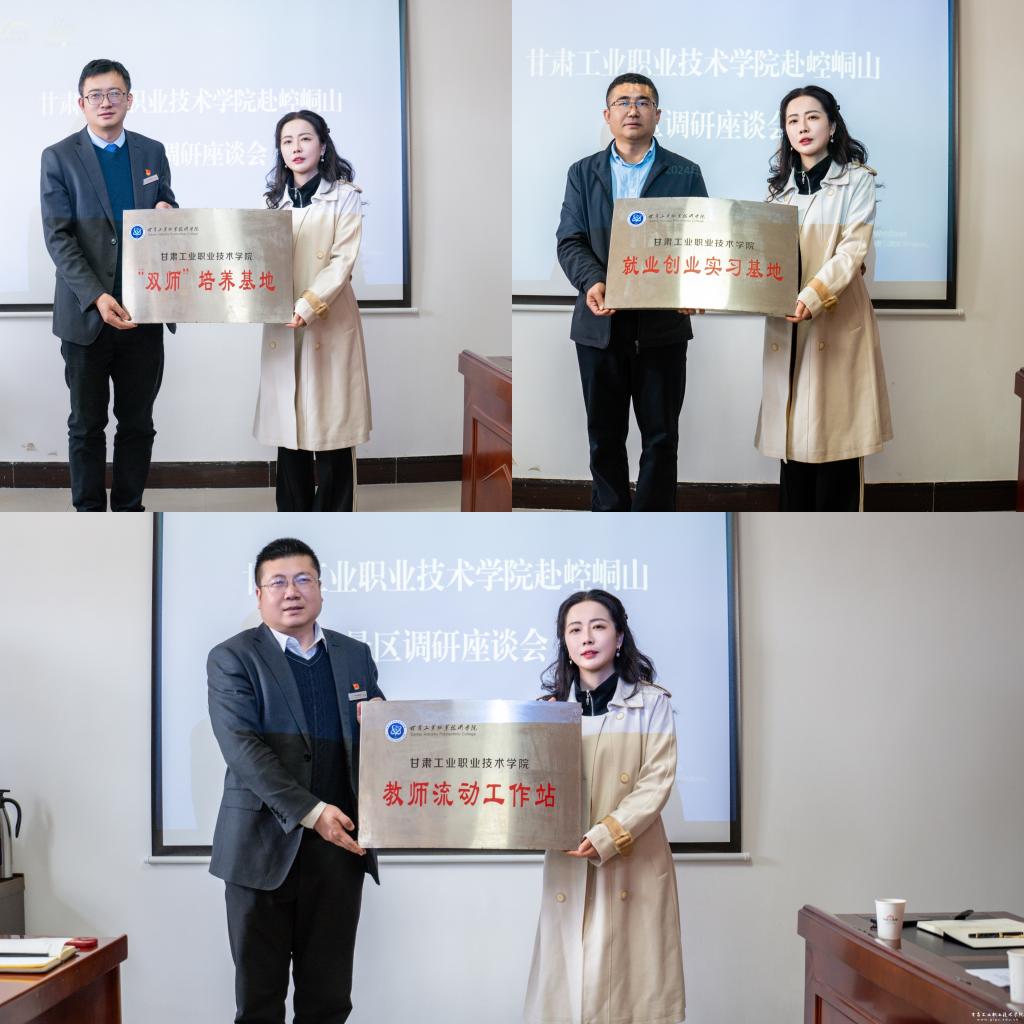 最后,进行了“双师型教师培养基地”、“甘肃工业职业技术学院教师流动工作站”、“丝路e创就业创业实践基地”授牌签约。此次校企合作授牌签约仪式推动了我校实现资源共享、优势互补、成果转换的进程,促进了校企良性互动,产学研一体化建设的校企深度合作。