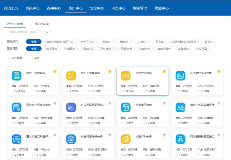 “一站式网上办事大厅服务”是我校基于教职工和学生的日常频繁使用业务需求,通过利用统一身份认证平台,为全校师生提供“一站式”的快捷办事服务。服务主要涉及学生请假、退复学申请、缓考申请等业务,教职工的请假和出差、教学任务查看、日程会议安排、工资查询、资产申请和报废、校内各场地使用申请等20多项业务,整合了教学、科研、人事、财务、图书、资产等校内各业务系统,极大的方便了校内师生的使用。