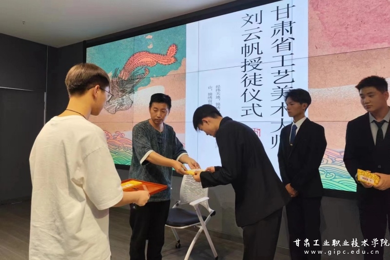 拜师仪式上,甘肃工艺美术大师、刺绣非遗传承人刘云帆坐上拜师椅,旅游学院酒店管理与数字化运营专业武辉文、姚锦右、韩帅帅3名同学集体向传承人师傅敬茶、呈递拜师帖,师傅接茶、回礼。整个过程简洁且不失庄重。