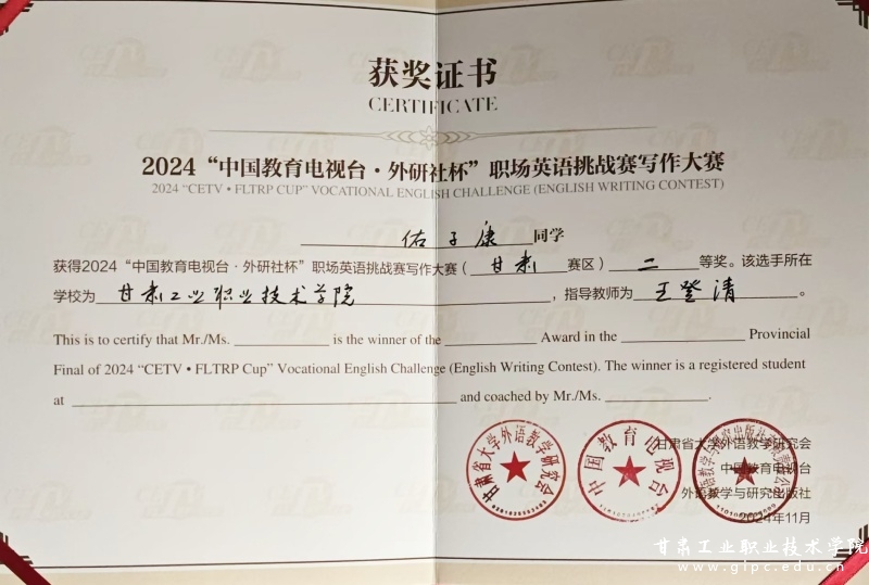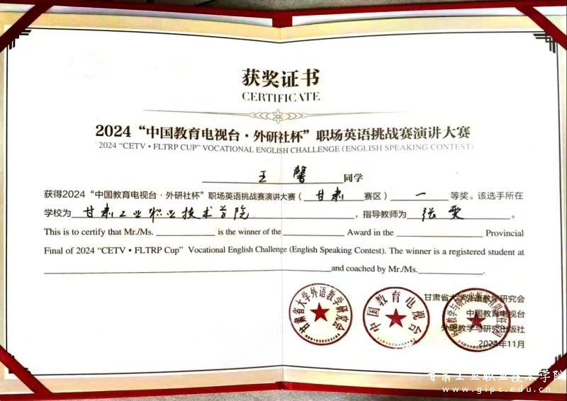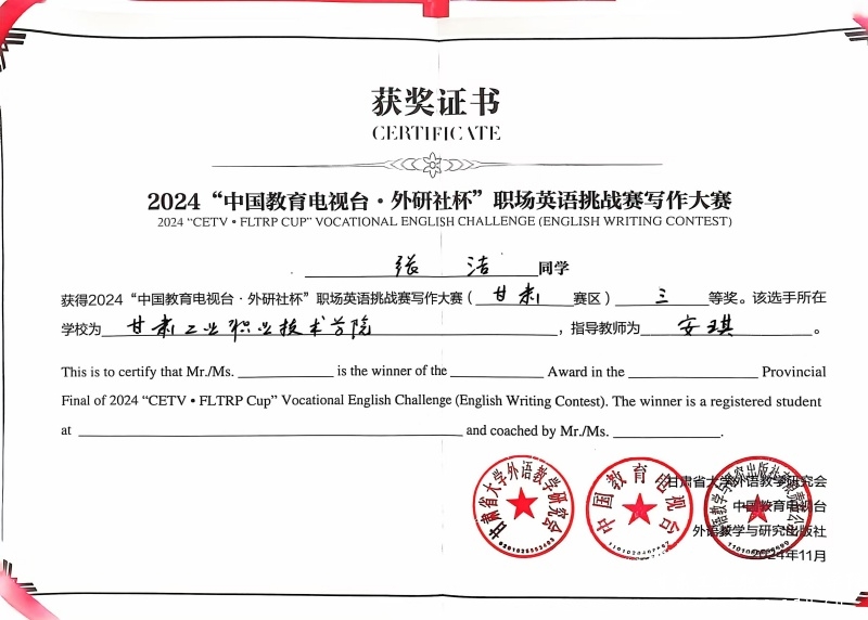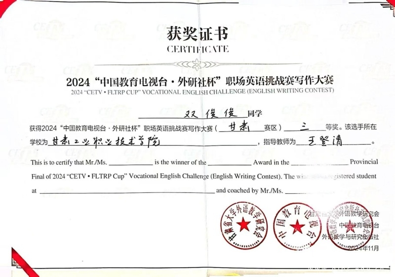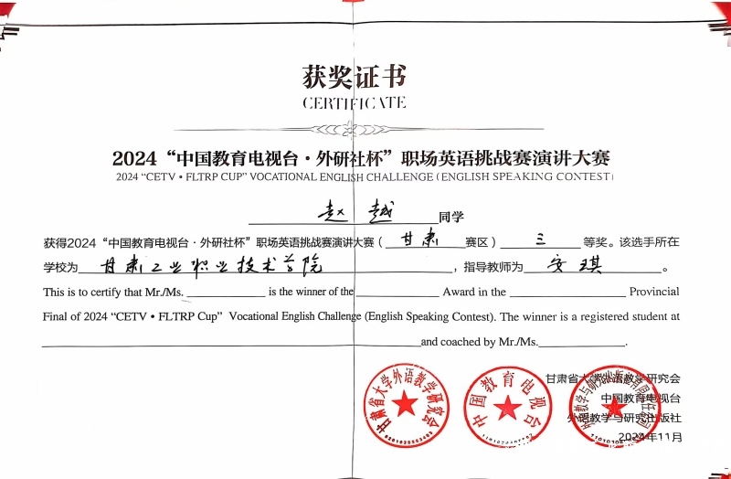 11月3日,2024年“中国教育电视台·外研社杯”职场英语挑战赛甘肃赛区比赛在兰州石化职业技术大学圆满落幕。来自全省13所参赛院校的指导教师和73名选手参加了此次比赛。我校学生王馨、佑子康在激烈的角逐中分别荣获演讲大赛一等奖和写作大赛二等奖,赵越、双俊俊、张洁、王婷荣获三等奖。