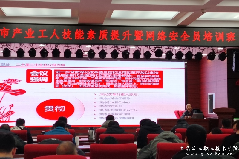 为进一步提升天水市产业工人技能水平,增强产业工人的就业竞争力和推动产业升级,提高电信系统网络与信息安全管理员网络安全意识和职业技能,12月21日,我校第三期工匠培训——天水市产业工人技能素质提升暨网络安全员培训在中国电信天水分公司顺利开班。此次培训由天水市总工会、甘肃工业职业技术学院主办,中国电信天水分公司、甘肃博通专修学院承办。天水市总工会党组成员、经审会主任赵建业,甘肃工业职业技术学院继续教育学院院长姜岩峰,甘肃博通专修学院院长程代全,中国电信天水分公司人力资源部主任陆立国同志出席开班仪式。来自中国电信天水分公司的网络信息安全管理人员及业务人员共计100人参加此次培训学习。