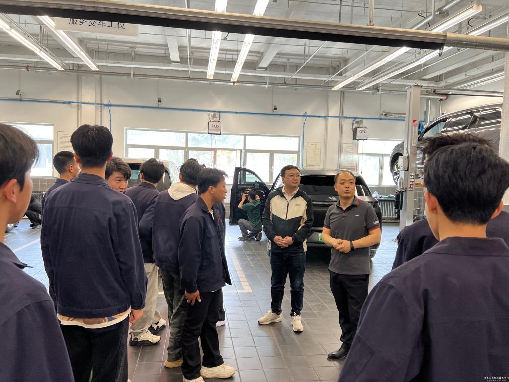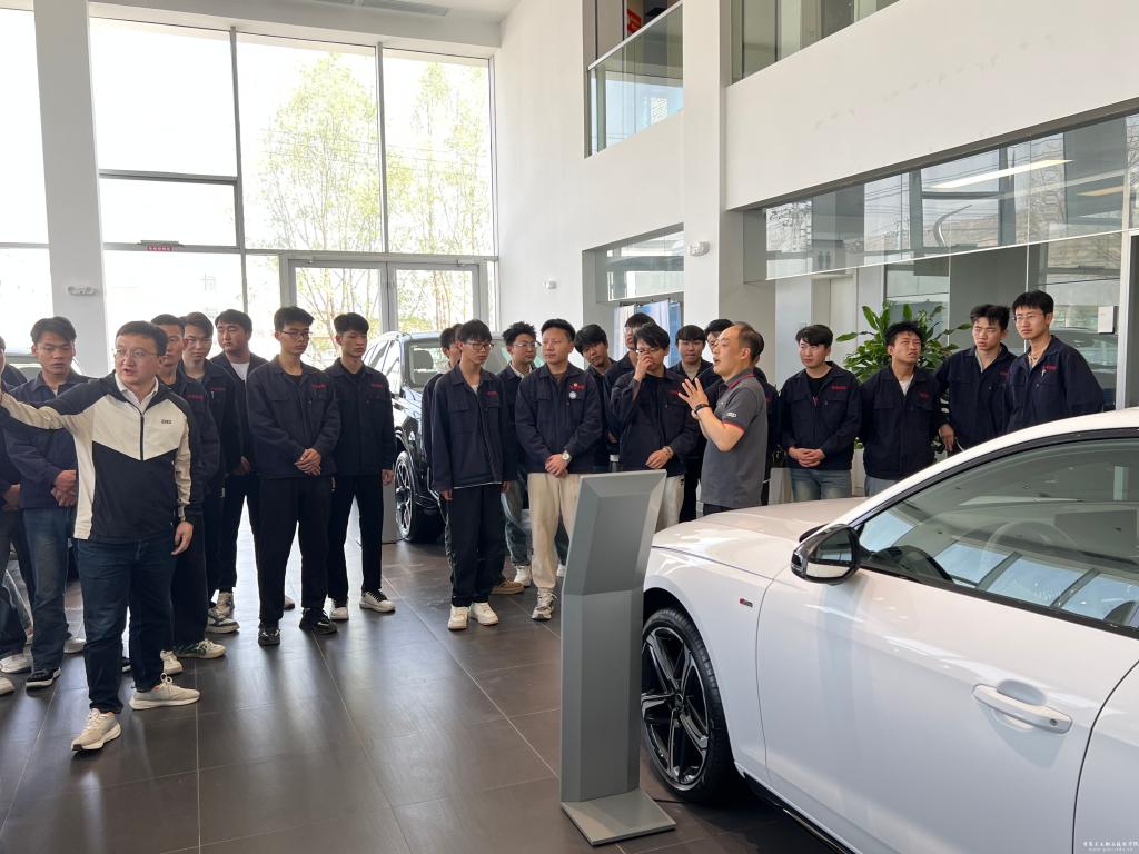 在4S店技术经理陈亚军的带领下,师生们参观了汽车销售展厅、售后服务车间及智能诊断中心,深入了解奥迪新能源汽车的发展现状、构造原理、智能化维保流程及客户服务标准。企业专家结合实车进行演示与现场讲解,同学们认真观摩、积极提问,与企业工程师就行业趋势、职业发展等话题展开交流。