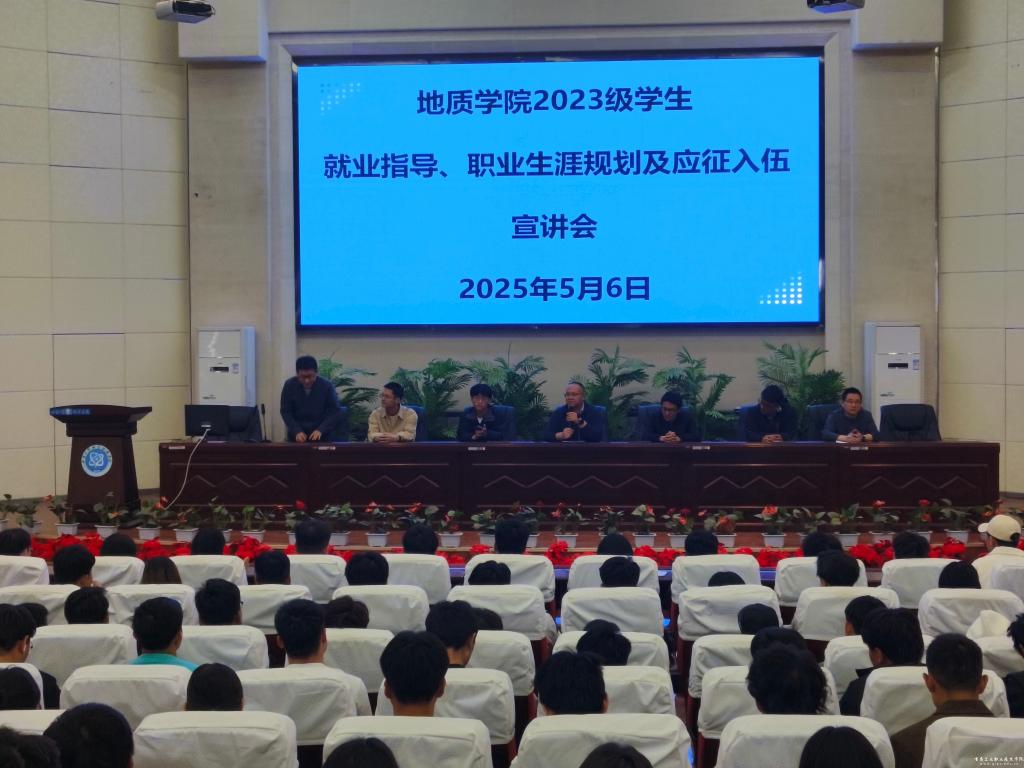 为帮助地质学院学生明确职业发展方向,提升就业竞争力,同时积极响应国家征兵号召,5月6日中午,地质学院在图书馆五楼报告厅召开“职业生涯规划、就业指导与征兵宣传”专题讲座。2023级全体学生、班主任及辅导员参会。