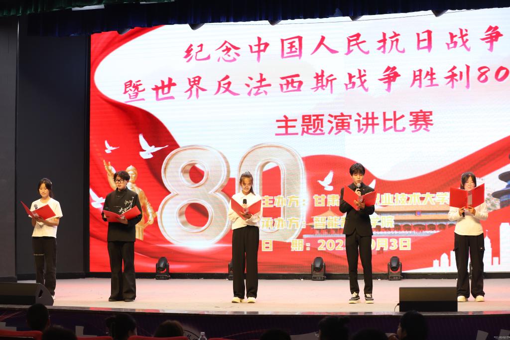9月3日,中国人民抗日战争暨世界反法西斯战争胜利80周年纪念日之际,由甘肃工业职业技术大学校团委主办、智能制造学院承办的主题演讲比赛,在学校大学生活动中心隆重举行并圆满落幕。