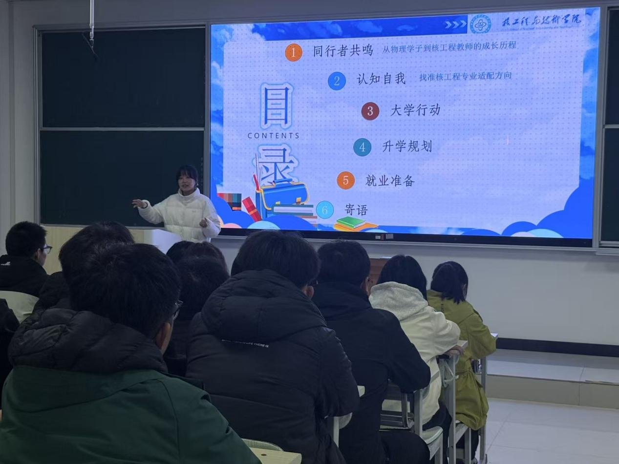 随后,青年骨干教师郑博维结合自身从本科生到研究生、再到高校教师的完整成长路径,分享了关于大学学习与人生规划的真切体悟。她通过真实生动的求学与执教故事,具体阐述了如何在专业学习、能力培养、视野拓展等方面把握大学时光,引导学生思考如何有意义地度过大学阶段、如何为未来人生奠定坚实基础。她还系统梳理了核工程类专业的发展脉络,深入解读行业前沿与人才需求趋势,帮助学生从更广阔的视角理解专业价值,明晰个人发展方向。