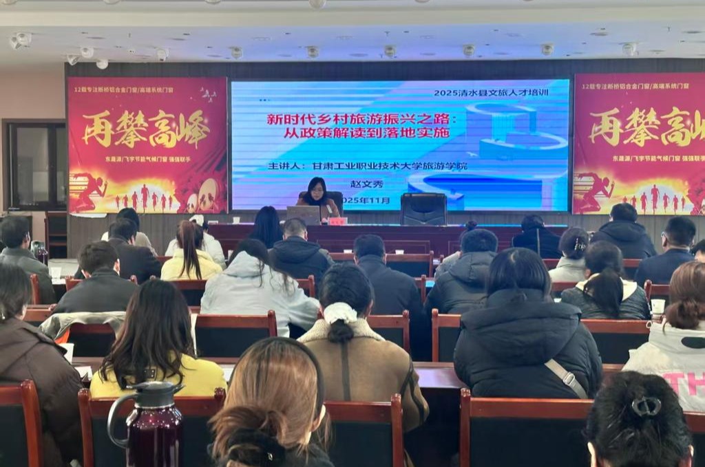 为深入贯彻党的二十届四中全会关于全面推进乡村振兴的决策部署,积极响应地方文旅发展需求,11月19日,我校旅游学院旅游管理专业主任赵文秀应清水县邀请,为该县2025年文化旅游人才培训班作《新时代乡村旅游振兴之路:从政策解读到落地实施》专题讲座。此次培训是我校发挥文旅教育资源优势、精准对接地方发展需求、服务乡村振兴战略的生动实践,也是推动旅游职业教育融入农业农村现代化的有力举措。