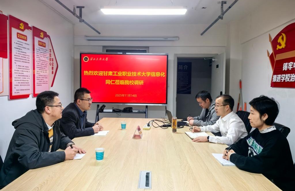 11月13日至14日,调研小组首先赴兰州理工大学、西北民族大学开展省内调研。在兰州理工大学,调研小组与该校信息中心负责人及相关业务骨干围绕智慧校园基础设施建设、数据中台搭建、师生信息化服务体系优化等议题进行深入座谈交流。会上,对方详细介绍了其在校园网络升级改造、教学资源数字化整合、智慧后勤管理等方面的实践案例,重点分享了以“数据驱动”提升校园治理效能的创新举措。随后,调研小组实地参观了该校智慧教室、数据中心机房、信息化服务大厅等场所,直观感受先进技术在教学、管理、服务中的融合应用。