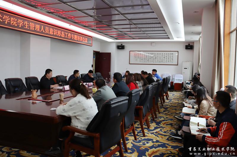 4月19日上午,学校在图书馆四楼会议室组织召开全体学管人员意识形态工作专题培训会。宣传统战部负责同志作题为《加强意识形态学习 提升思想引领 筑牢安全“防火墙”》的专题辅导,各二级学院分管学生工作副书记、全体专职辅导员参加培训。培训会由学工处处长曹惠清主持。