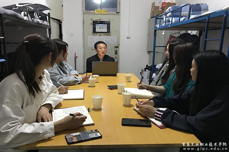 5月6日晚,旅游学院辅导员顿学斌、靳凡走进3号学生公寓101宿舍,开展党史学习教育。