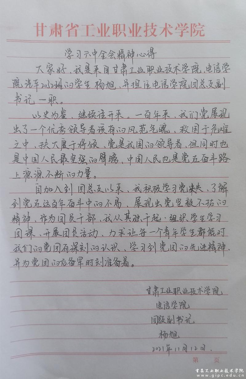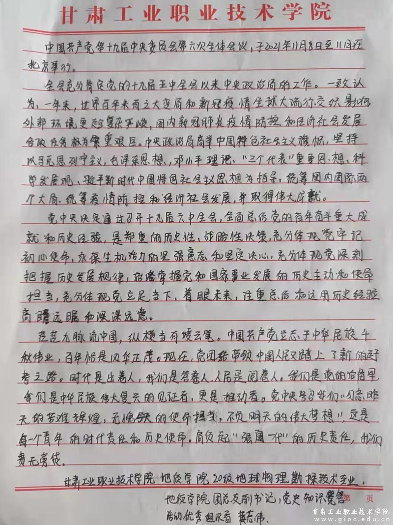 过去一百年,党向人民、向历史交出了一份优异的答卷。现在,党团结带领中国人民又踏上了实现第二个百年奋斗目标新的赶考之路。我校青年学子积极学习全会精神,将初心融进灵魂、把使命扛在肩上,在忆苦思甜中感受中华儿女的英雄气概,在继往开来中凝聚伟大复兴的磅礴力量,在鉴古知今中夯实为民服务的坚毅初心。一代人有一代人的使命,未来我们定会砥砺前行,为祖国贡献自己的力量。