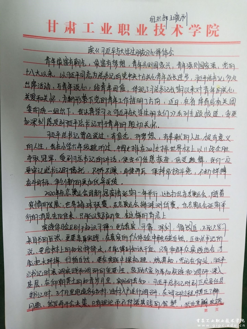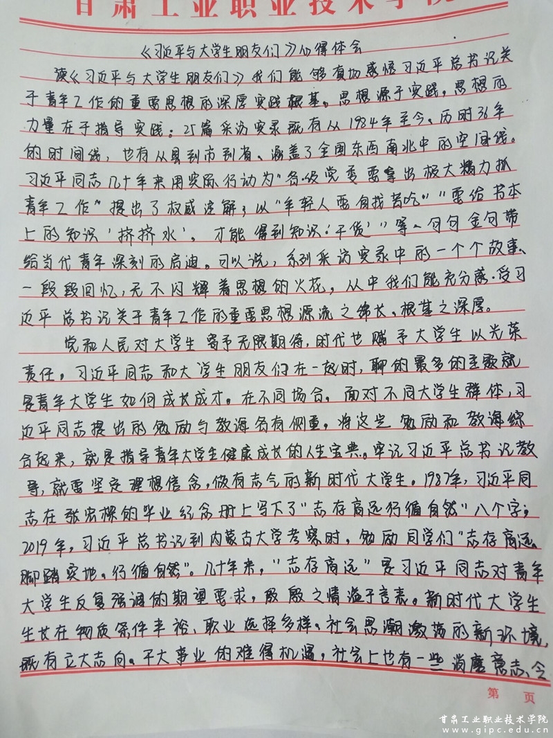 经过认真学习和研读,甘工院学子纷纷表示,作为新时代的青年大学生,一定不能辜负习近平总书记重托,勇敢担负起历史使命,做有志气、有才气、有锐气、有骨气的新时代中国青年,成长为德智体美劳全面发展的社会主义建设者和接班人,在践行中国梦的生动实践中用奋斗精神展示出青春最亮丽的底色!