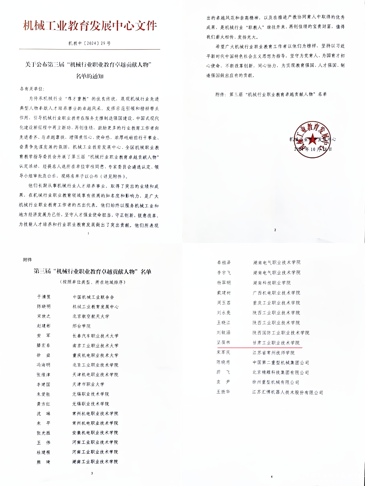 为传承机械行业“尊才重教”的优良传统,展现机械行业先进典型人物奉献人才培养事业的卓越风采,发挥示范引领和榜样带头作用,10月20日上午,机械行业职业教育卓越贡献人物(第三届)授牌仪式在北京天泰宾馆成功举行,我校党委书记坚葆林入选第三届“机械行业职业教育卓越贡献人物”。