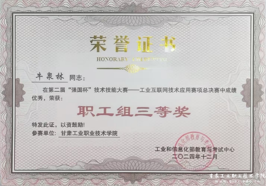 三尺讲台育栋梁,技能切磋展风采。我校电子信息学院牛泉林、侯鹰龙2名教师在第二届“强国杯”技术技能大赛工业互联网技术应用赛项中荣获职工组三等奖。该赛事由工业和信息化部教育考试中心主办,在山东烟台职业学院举行。